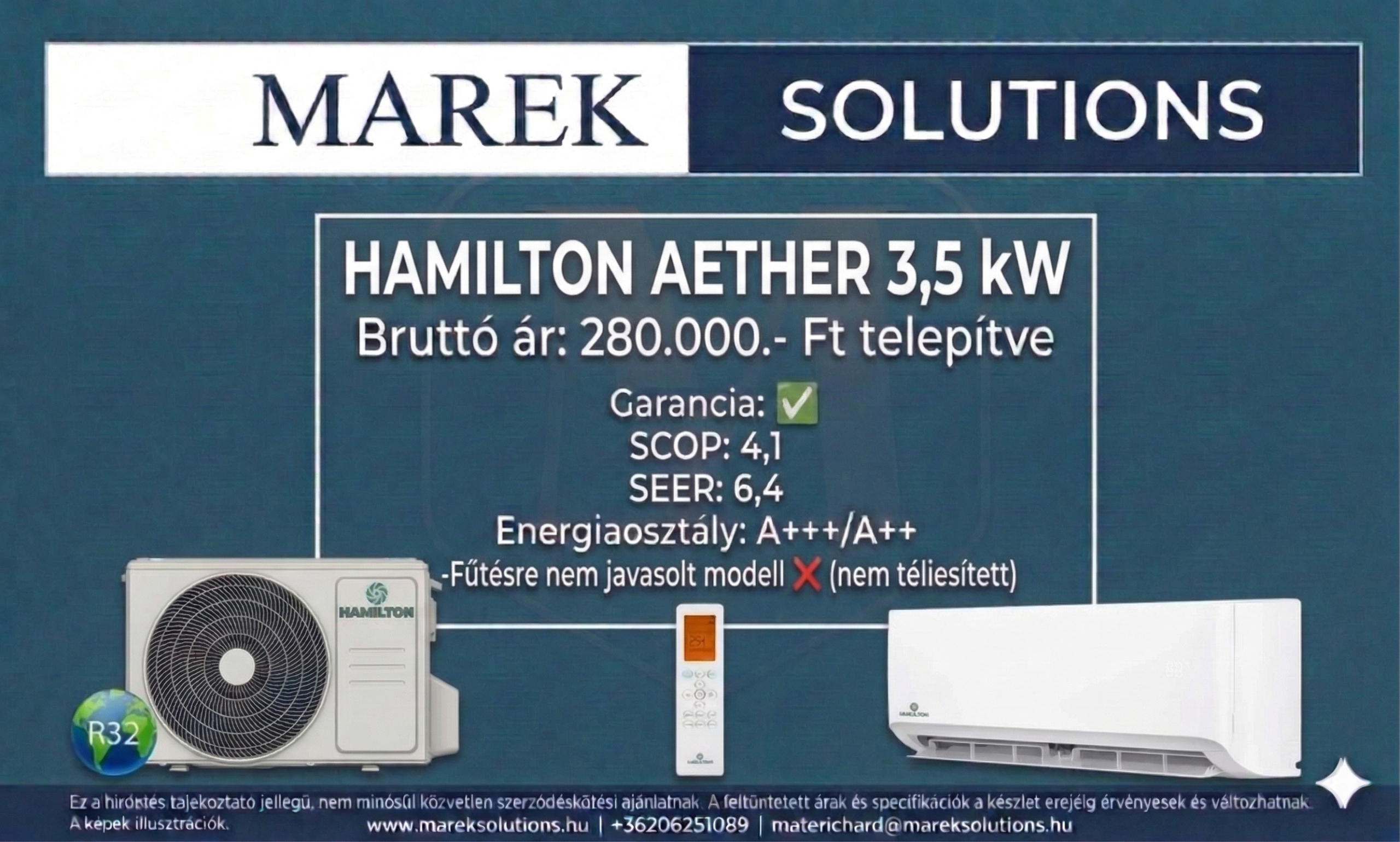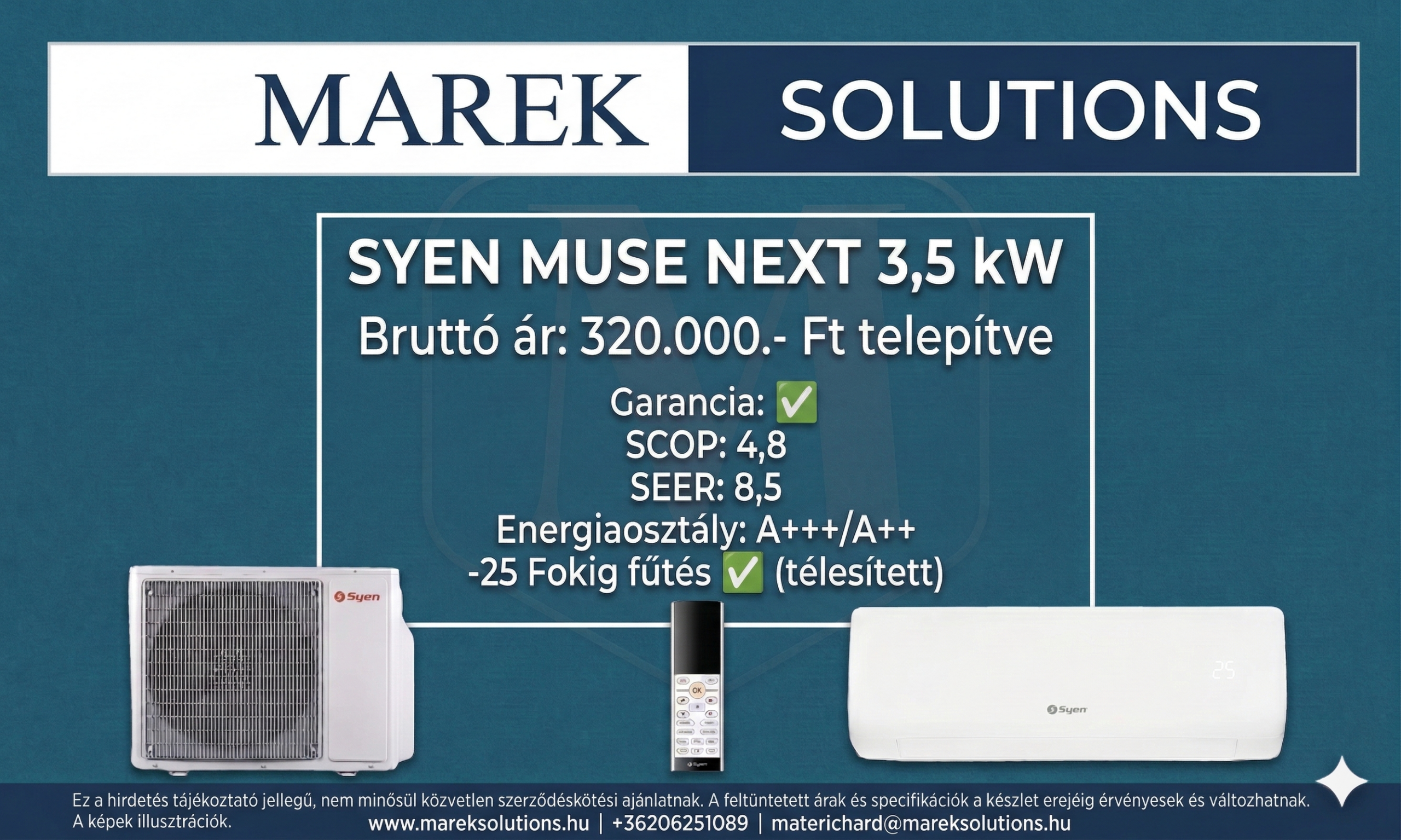 A feltüntetett készülékárak alaptelepítéssel értendők, amely tartalmazza a beltéri és kültéri egység felszerelését, a csővezeték kiépítését 3 méterig, valamint a munkadíjat. Az ezen felüli extra anyagköltségek (pl. hosszabb csövezés, falon kívüli kábelcsatornázás, speciális konzolok) a helyszíni igények szerint változhatnak.